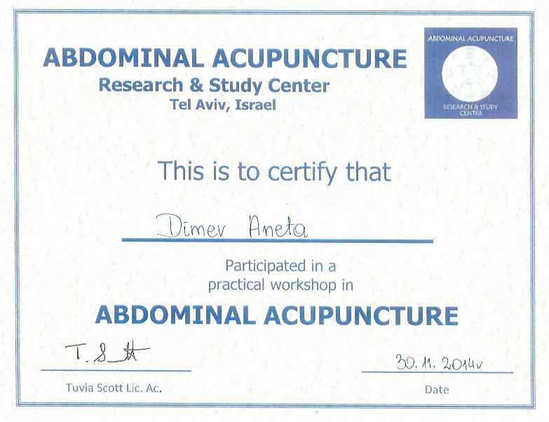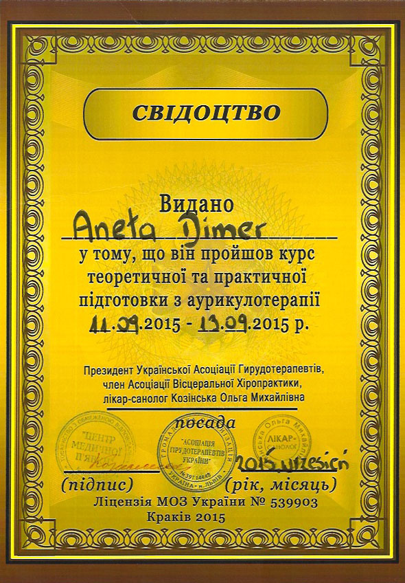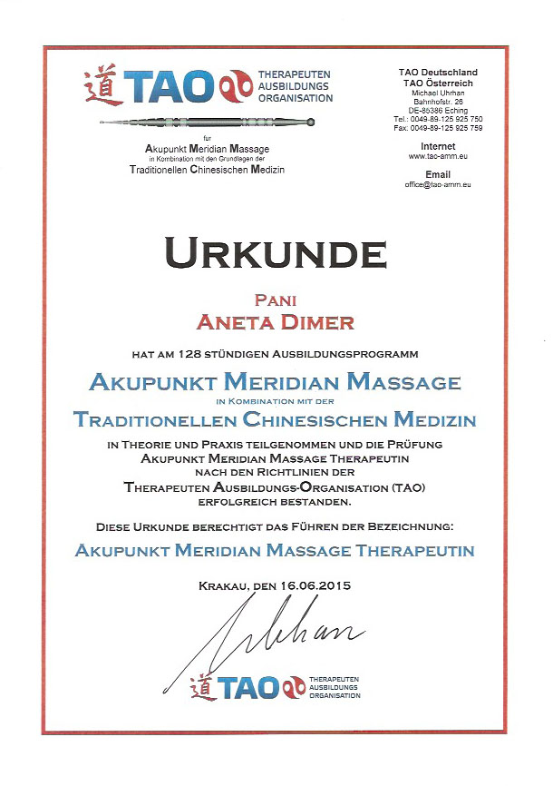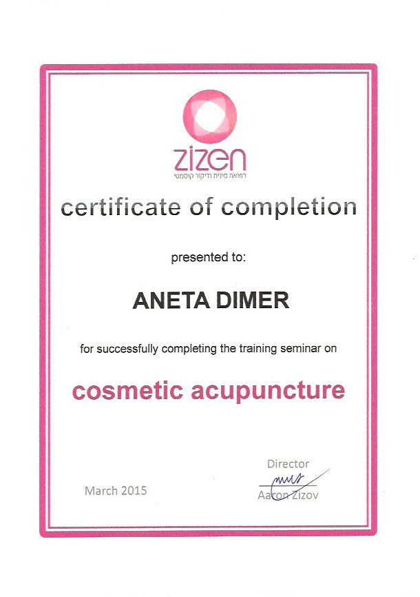Witam mam na imię Aneta Dimer. Interesuję się holistycznym podejściem do zdrowia. W myśl koncepcji ,,większość chorób ma swój początek w układzie pokarmowym,, oraz w stylu życia jaki prowadzimy, naukę zaczęłam od studiowania dietetyki w medycynie chińskiej TCM. Później tylko pogłębiałam wiedzę z medycyny chińskiej i robię to do dziś. Ukończyłam 3,5-letnią Szkołę Akupunktury, praktykowalam w klinikach w Izraelu. Dużo podróżuję, po Europie i Stanach Zjednoczonych, uczestniczę w konferencjach TCM ucząc się od wspaniałych mentorów różnych technik, metod naturalnego leczenia.
