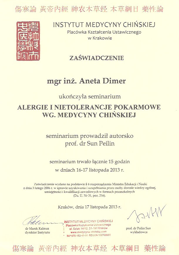 - Dietetyka profilaktyczna i lecznicza w medycynie chińskiej (1,5 roku)